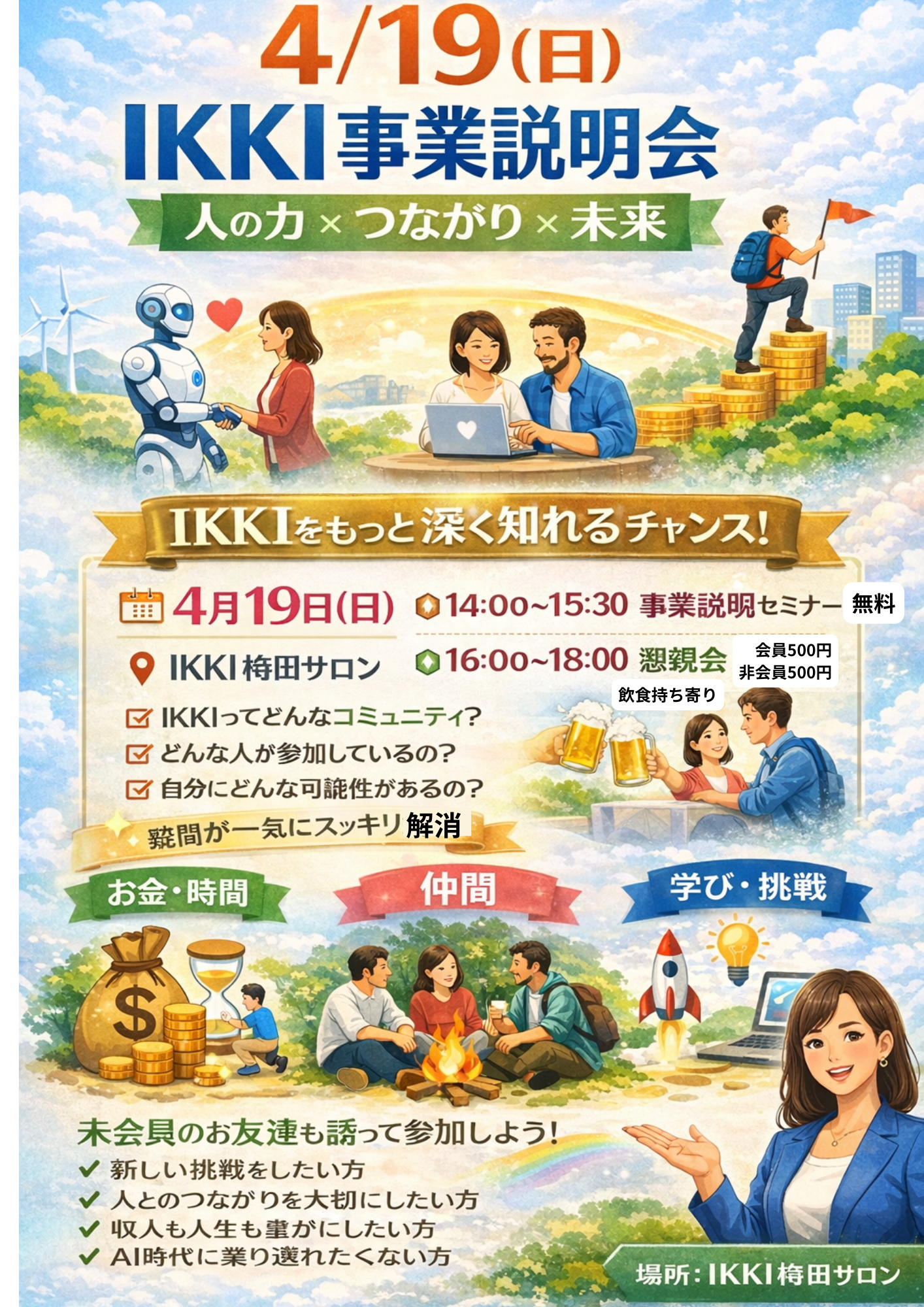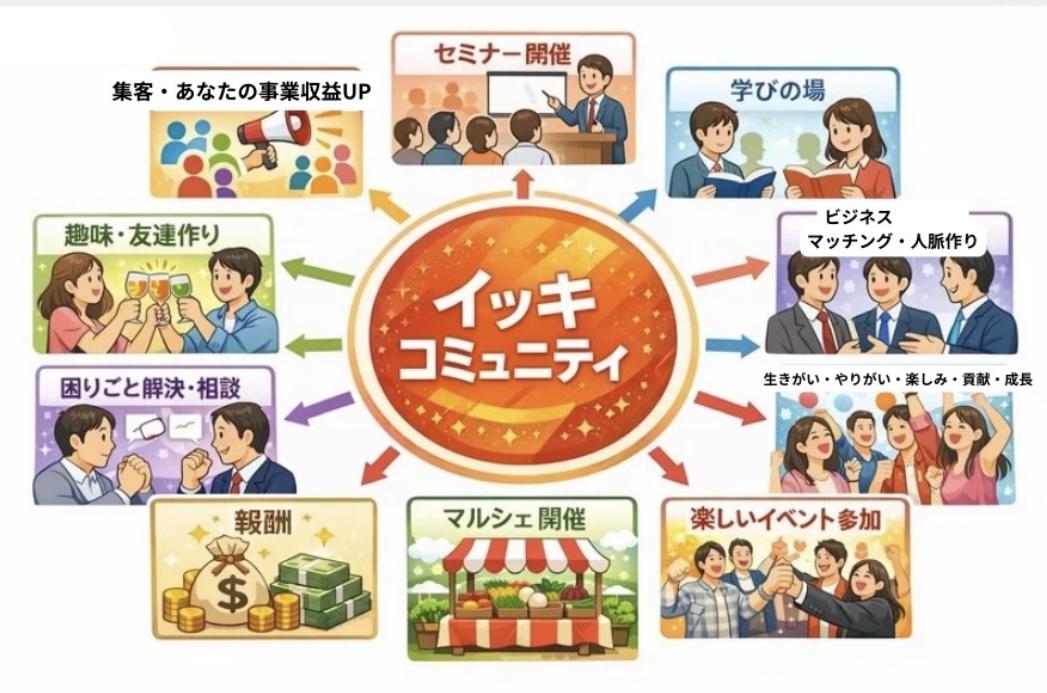 みんな仲間という感覚がすごくあり、めちゃくちゃ居心地が良い。社長は人が大好きで、本部長はギャグが面白い! 何か嬉しいことがあって誰かに話したいとき、ちょっと落ち込んだとき、気軽にサロンに行って話すとスッキリします! お花屋さんや占い屋さんや服屋さんや飲食店などなど自分でビジネスされてる方は、なんと!アピールしながらお金も貰えちゃうかも! 正直、これから伸びまくるIKKIに入るのは今が激熱だYo!!! とりあえず登録してサロンで遊びましょう!!!